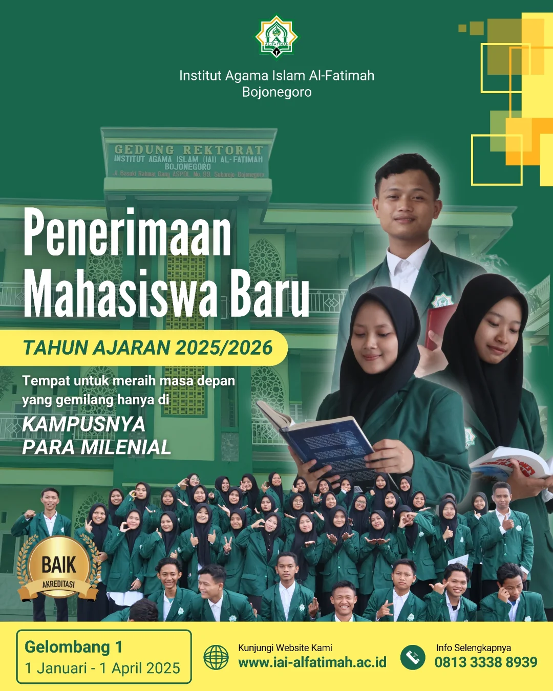 Institut Agama Islam (IAI) Al-Fatimah Bojonegoro kembali membuka Penerimaan Mahasiswa Baru (PMB) untuk Tahun Ajaran 2025/2026. Kampus yang dikenal dengan sebutan Kampusnya Para Milenial ini hadir sebagai tempat terbaik untuk meraih masa depan yang gemilang melalui pendidikan tinggi berbasis keislaman, pesantren, dan kewirausahaan. 🎓 Kampusnya Para Milenial IAI Al-Fatimah Bojonegoro terus berkomitmen mencetak generasi muda yang berilmu, berakhlak, dan berjiwa mandiri. Dengan suasana akademik yang modern dan religius, mahasiswa didorong untuk berkembang tidak hanya dalam bidang akademik, tetapi juga dalam keterampilan praktis dan soft skill yang relevan dengan dunia kerja. 📚 Program Studi yang Ditawarkan IAI Al-Fatimah Bojonegoro memiliki beberapa program studi unggulan di bidang pendidikan dan keislaman, seperti: Setiap program dirancang untuk menghasilkan lulusan yang kompeten, berdaya saing, dan siap berkontribusi di masyarakat. 🕓 Jadwal Pendaftaran Pendaftaran Gelombang 1 dibuka mulai 1 Januari hingga 1 April 2025.Calon mahasiswa dapat melakukan pendaftaran melalui laman resmi kampus:🌐 www.iai-alfatimah.ac.idatau menghubungi kontak resmi PMB:📞 0813 3338 8939 🌟 Akreditasi dan Fasilitas Dengan akreditasi BAIK, IAI Al-Fatimah Bojonegoro menyediakan fasilitas kampus yang lengkap dan lingkungan belajar yang kondusif bagi mahasiswa untuk tumbuh dan berprestasi. ✨ Raih masa depanmu bersama IAI Al-Fatimah Bojonegoro — Kampusnya Para Milenial!
