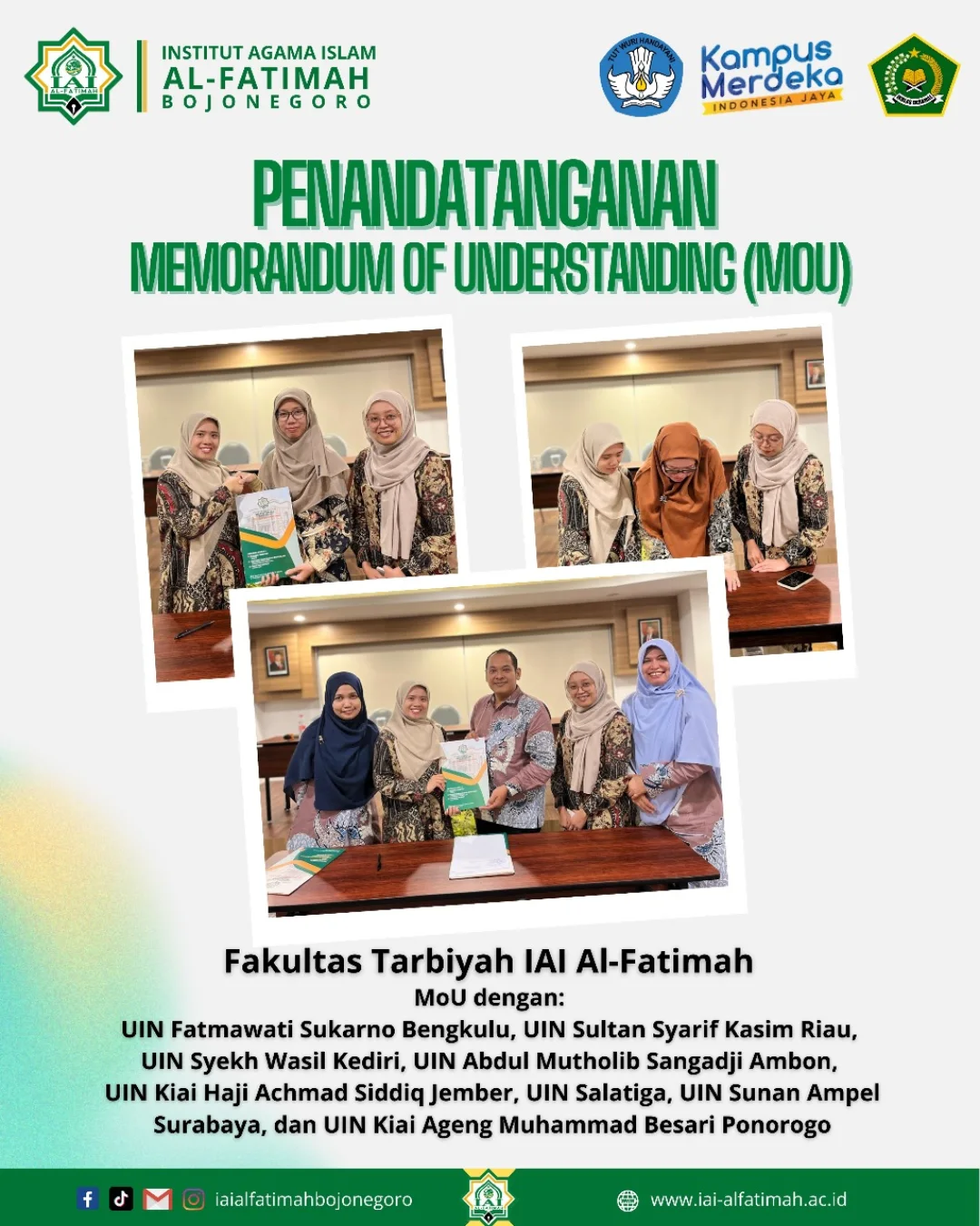 Bojonegoro, Oktober 2025 — Fakultas Tarbiyah Institut Agama Islam (IAI) Al-Fatimah Bojonegoro terus memperluas jejaring akademik melalui penandatanganan Memorandum of Understanding (MoU) dengan berbagai universitas Islam negeri di Indonesia.